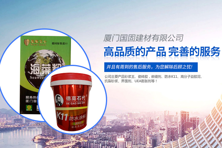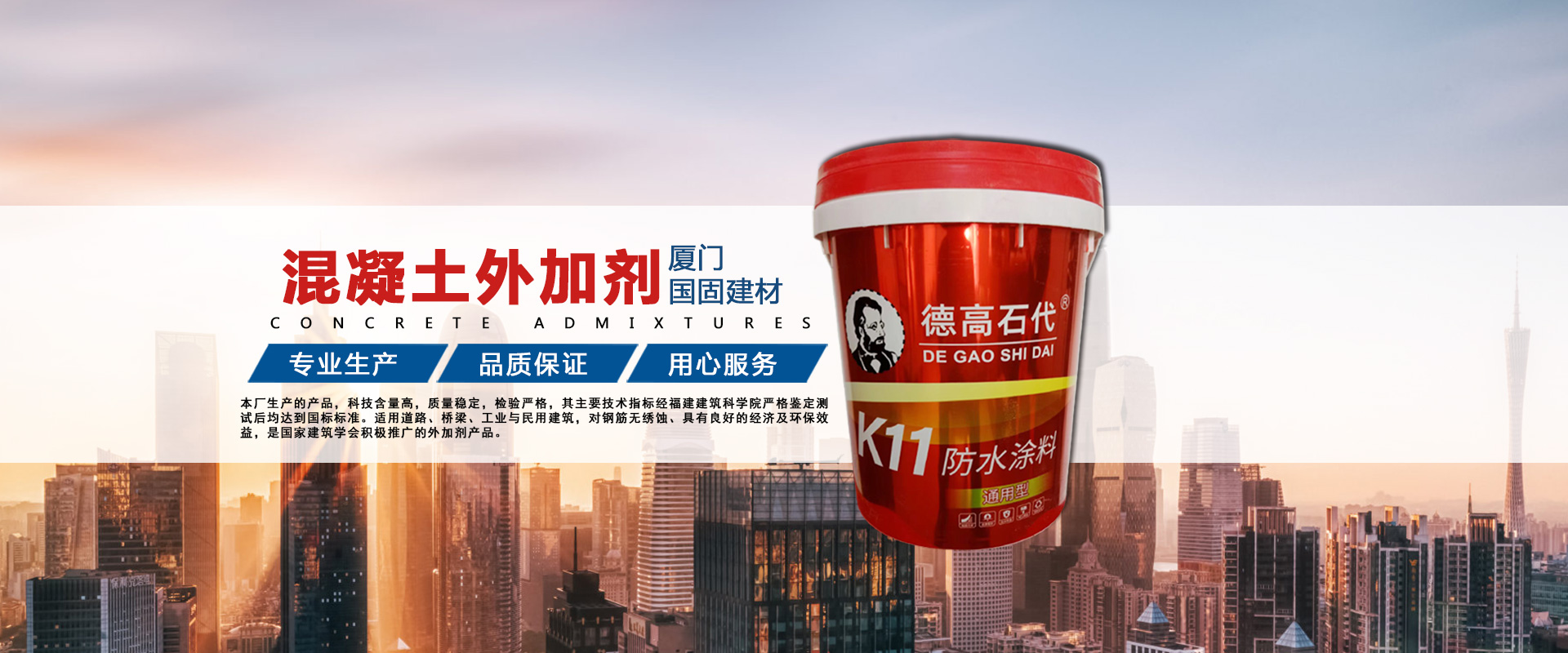 ??廈門國固建材有限公司是集科研開發,生產為一體的混凝土外加劑科技生產單位,公司技術力量雄厚,工藝科學先進,產品質量及性能在全國同行業中。并且有周到的售后服務,為您解除后顧之憂。本廠生產的產品,科技含量高,質量穩定,檢驗嚴格,其主要技術指標經福建建筑科學院嚴格鑒定測試后均達到國標標準。是目前水泥制品中理想的名加劑產品,適用道路、橋梁、工業與民用建筑,對鋼筋無繡蝕、具有良好的經濟及環保效益,是國家建筑學會積極推廣的外加劑產品。本廠推廣標準化,規范化、程序化管理、具有健全、完善、持續穩定運行的質量保證體系。產品遠銷上海、江蘇、浙江、廣州、北京、江西、安徽、福建等地,在大批國家建設工程中應用效果良好,并以性能優越、質量可靠、以及良好的售后服務在市場上享有很高的信譽。本廠在今后的歷程中,將一如既往的為您提供高質量、高科技的產品,完善的服務以感謝廣大客戶的支持和厚愛?!翱萍紕撔?、以誠為本,用戶滿意”是我公司發展的永恒目標,我們堅持“以誠結情、質量取勝”,以高品質的產品回報社會?!坝每婆d建材,創優品工程”,期待與各界朋友與時俱進,努力開拓進取,力求為用戶提供“高品質的產品,完善的服務”。公司愿與設計部門、建設單位、施工企業及同行們攜手合作,共創未來,共鑄輝煌、公司主要產品砂漿王、瓷磚膠,嵌縫劑、防水K11、高分子益膠泥、抗裂砂漿、界面劑、UEA膨脹劑等!